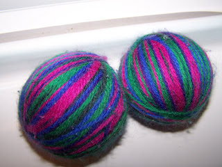 As for the Monkey Balls Wool Dryer Balls - I LOVE 'EM!! They have been in every load of laundry since Michelle dropped them off and I've had no problems at all with unravelling. I like them a lot better than the plastic ones because they are so much quieter. (I have enough noise in this house with 2 boys!) I also like that they are scented and our clothes smelly yummy when they come out of the dryer! As for drying time, I usually set the dryer for 70 minutes for our cloth diapers and everything is completely dry except for the hemp inserts for the Thirsties Duo Diaper and the snap in for the GroVia diapers since they take longer to dry. I usually put those on the drying rack in the laundry room to finish drying. With the wool dryer balls, I set the timer for 60 minutes and EVERYTHING was DRY!